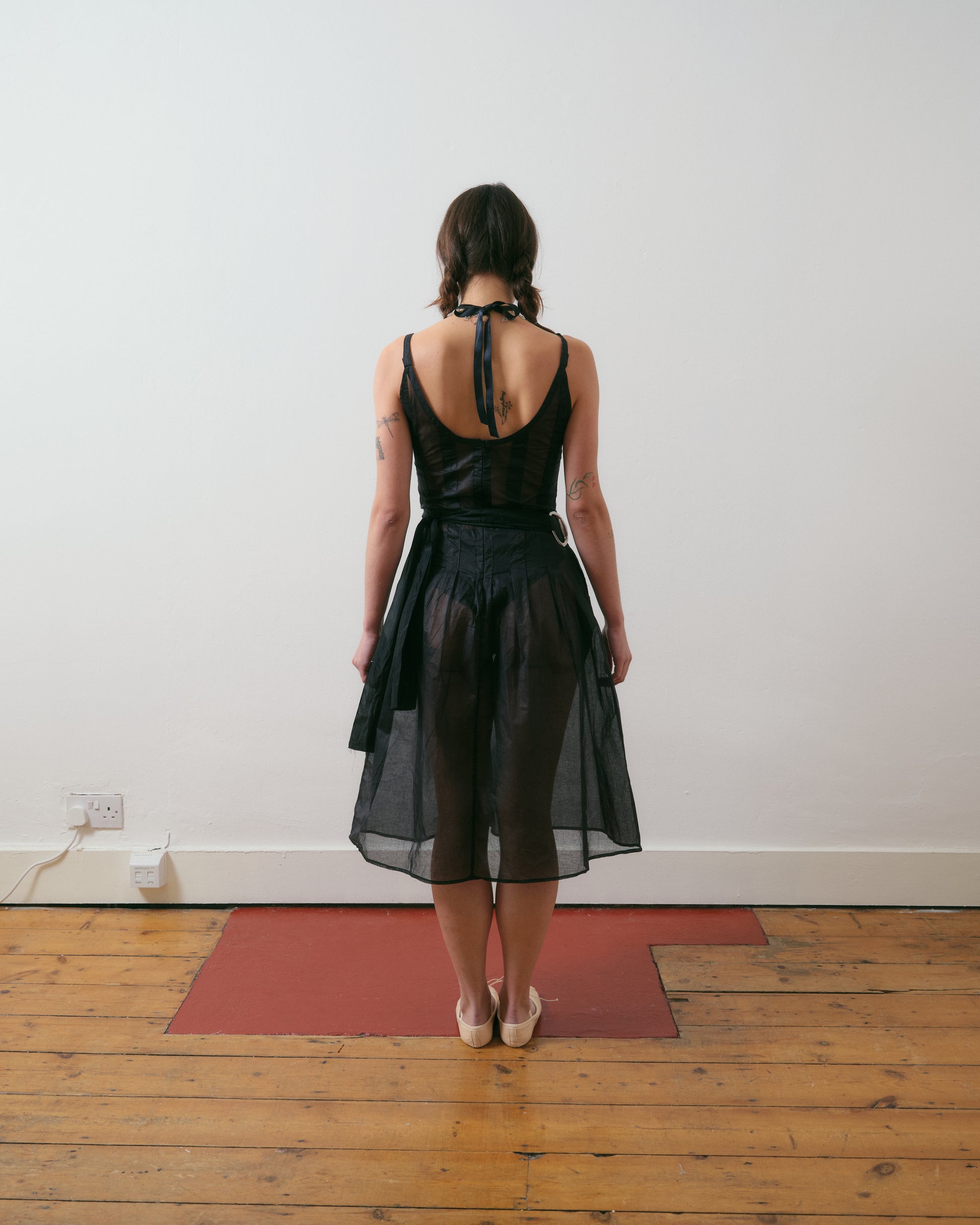 The pleated dress is made in black cotton organdie. It features an invisible zipper down the back with a hook and eye closure, pockets and adjustable straps.